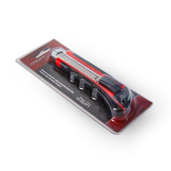 Канцелярский нож C-CUT1, пластиковый, прорезиненная рукоятка, с выдвижным сменным металлическим лезвием. На лезвие имеются насечки для упрощения обламывания затупившегося сегмента.