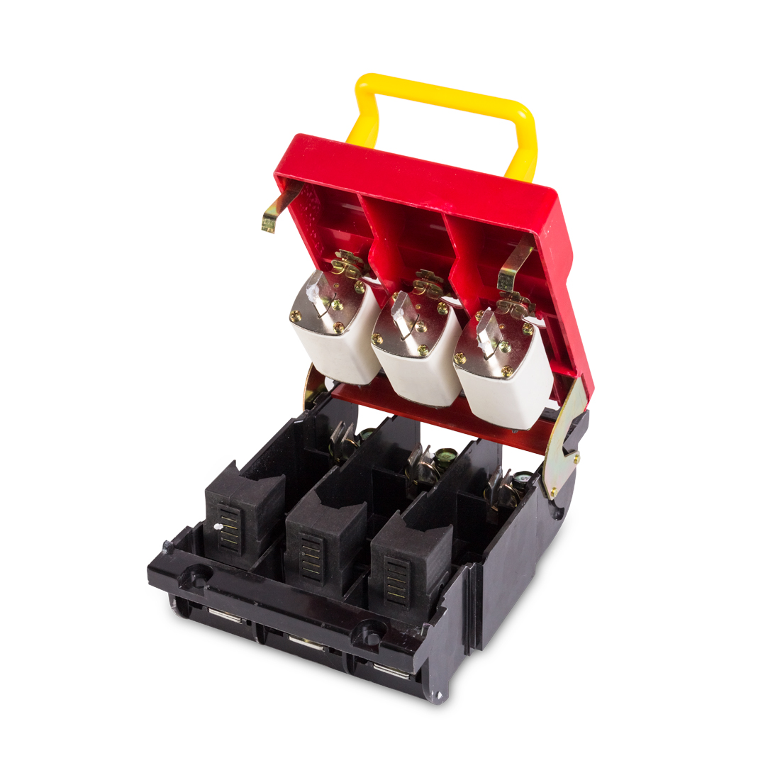 3 пары контакторов и дугогасительная камера установлены на основании с изоляционной прокладкой. Предохранители устанавливаются на крышке-держателе. Дугогасительная камера сделана из прессованного пластика. Благодаря своей простой конструкции она легко демонтируется или устанавливается. На разъединитель установлен пружинный механизм для быстрого отключения, который позволяет безопасно отключать рубильник в чрезвычайно тяжелых условиях работы.