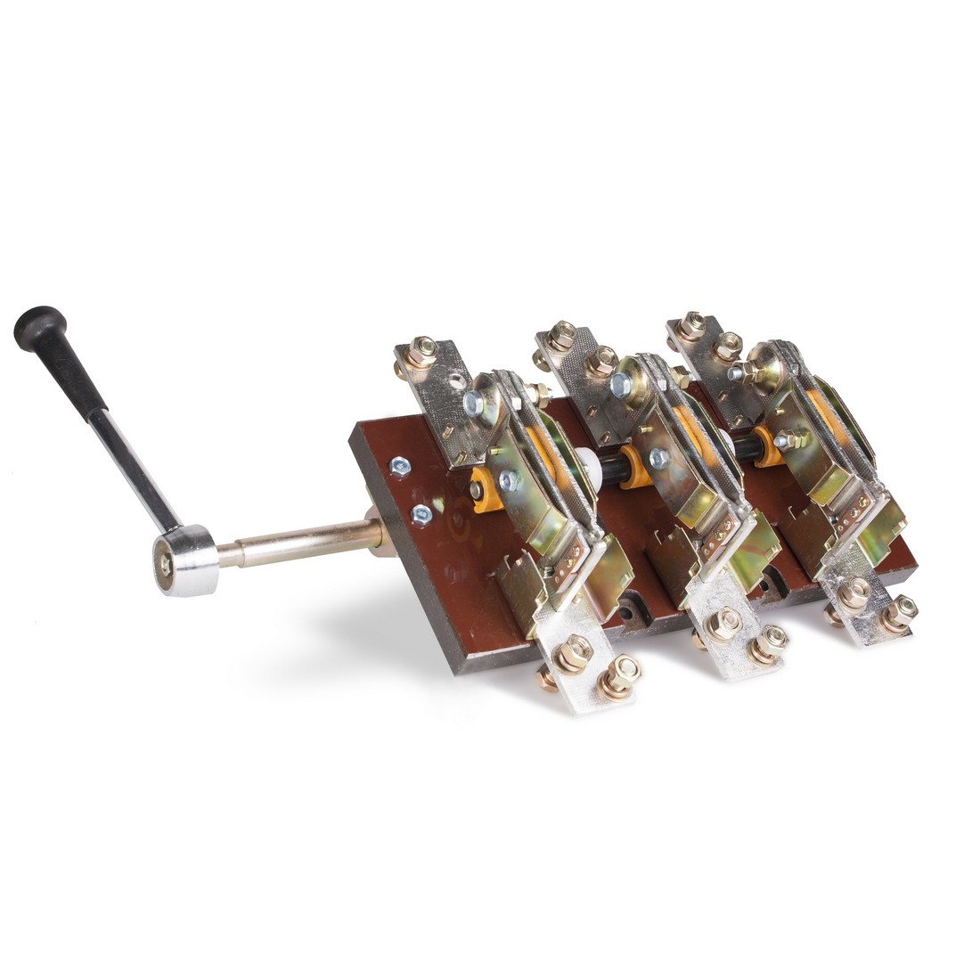 Это низковольтный выключатель с боковым ручным приводом и металлическими ножевыми контактами.