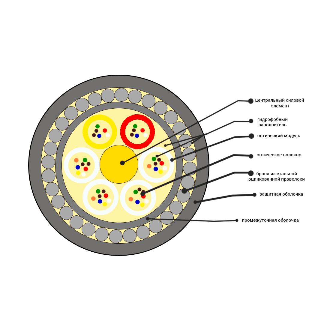 Кабель содержит сердечник модульной конструкции с центральным силовым элементом из стеклопластикового прутка, вокруг которого скручены оптические модули методом правильной SZ-скрутки. Внутри оптических модулей свободно уложены оптические волокна. Свободное пространство внутри оптических модулей и межмодульное пространство заполнено гидрофобным заполнителем. Сердечник скреплен нитями. На сердечниках наложена ПЭТ-лента, закрепленная нитью. Поверх сердечника накладывается промежуточная оболочка из полиэтилена.Поверх оболочки накладывается броня из стальных оцинкованных проволок. Свободное пространство между промежуточной оболочкой и элементами бронепокрова заполняется гидрофобным заполнителем. Поверх проволочной брони накладывается защитная оболочка из полиэтилена высокой плотности.