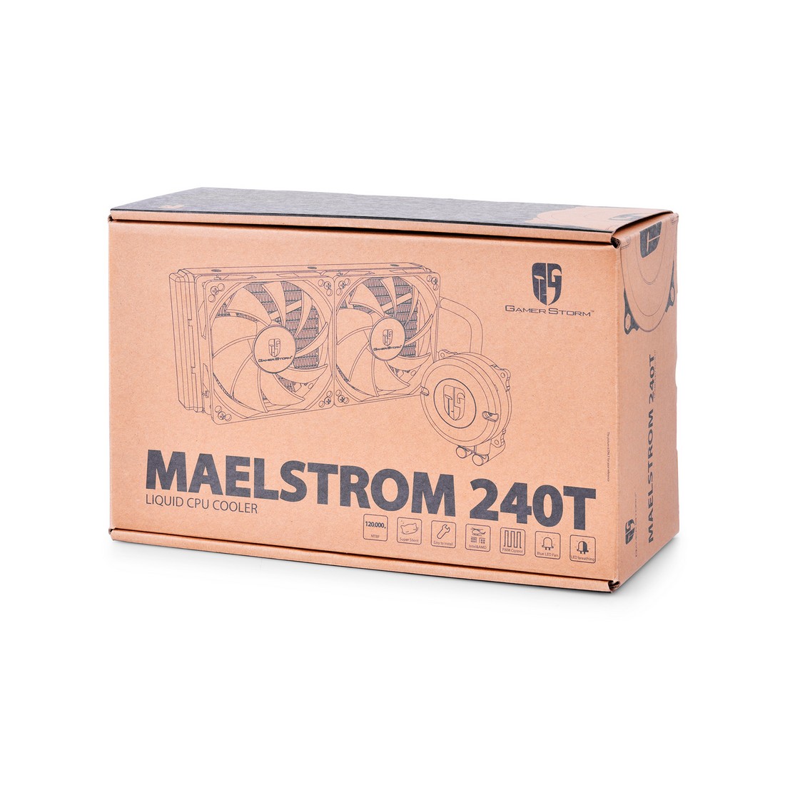 Не обслуживаемая система жидкостного охлаждения под все современные платформы и процессоры. Совмещенная с медным теплообменником помпа, обеспечивает лёгкость установки и минимум занимаемого пространства в корпусе ПК. Конструкция включает в себя медный водоблок со структурой 0,2-миллиметровых микроканалов для улучшения теплопроводности, помпу с керамическими деталями, две трубки и радиатор. Алюминиевый радиатор размером 274 х 120 х 27 мм оптимизирован для низких оборотов вентилятора и низкого уровня шума. Стандартные крепёжные отверстия позволяют легко устанавливать 120-мм вентиляторы. Два 120 мм вентилятора с голубой LED подсветкой. Бионическая "дышащая" подсветка логотипа GAMER STORM на помпе активируется во время работы. Срок службы помпы 120000 часов.