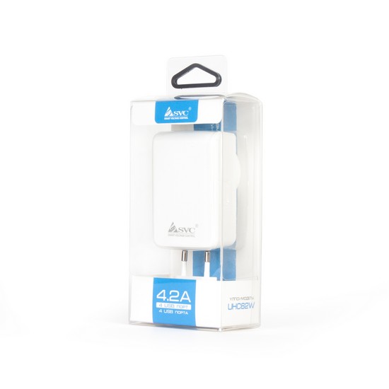 Зарядное устройство SVC UHC62W работает от обычной бытовой сети переменного тока и позволяет быстро заряжать мобильный телефон, смартфон, планшетный компьютер и другие цифровые устройства. Четыре порта USB обеспечивают одновременную зарядку сразу четырёх девайсов. Универсальное USB зарядное устройство SVC UHC62W гарантирует высокий уровень безопасности и надежности при использовании.